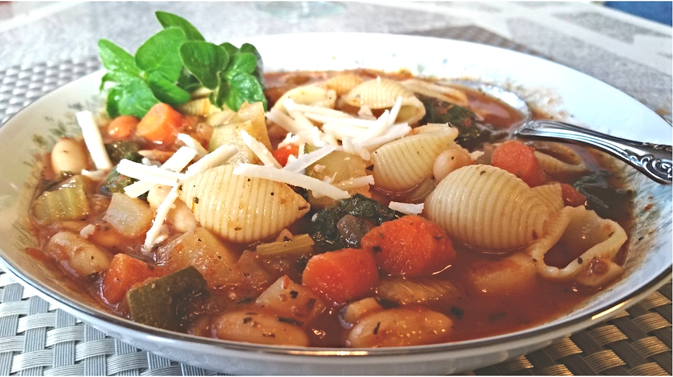 2 Tblspns olive oil 2 onions, chopped 2 garlic cloves, minced One, 28 ounce can of crushed tomatoes 3 cups vegetable broth 1/2 cup red wine 2 carrots, sliced 3 celery stalks, chopped 1 cup chopped zucchini 1 cup (medium sized) shell pasta 5 ounces of fresh baby spinach One 19 ounce can of cannellini beans (rinsed and drained) 2 bay leaves 1 tsp each: dried oregano, basil, and thyme 1/2 tsp black pepper 1 tsp salt Grated Parmesan, Romano and Asiago cheese blend (to sprinkle over top of each serving) Directions: In a large saucepan, heat the oil and add the onions and garlic. Cook the onions/garlic for about 5 minutes, or until softened. Add the tomatoes, broth, wine, bay leaves, carrots, zucchini, celery, bring to a boil and cook (simmer) for 15 minutes. Add the pasta and cook for another 10 minutes or until the pasta is just done. Add the beans, spinach, dried herbs, salt and pepper. Return to a low boil and cook for about 5 minutes or until the spinach is done. Remove and discard the bay leaves. Serve hot with the grated cheese sprinkled on top of each serving.